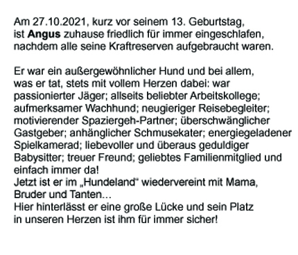 So bleibt uns nur als Trost, dass sie in ihrem Leben ihre Jagdpassion ausleben konnte und jetzt mit all ihrer Verwandschaft die nicht mehr unter uns weilt, unbegrenzt jagen kann.